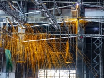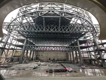 武夷水秀剧场提升改造项目总投资2亿元,系钢桁架结构装配式建筑(主体装配率100%),总用钢量超过4700吨。改造内容包括舞台改建、智能化系统升级、观演配套建筑和办公建筑立面提升等多个方面。本项目体量庞大、技术复杂,具有工期紧,屋面钢桁架跨度大(72.5m),钢桁架悬挑长度大(15.6m),侧屏导向梁单臂悬挑13.9米(安装精度控制在0.01毫米),钢桁架重量大(单榀重量超过1000kN),舞台机械设备复杂且精度要求高,铝单板幕墙层层交错、悬挑长度大(1.9米)、单片面积超大(高8.75米,宽2.04米),双腔整体装配式内隔墙等难点。