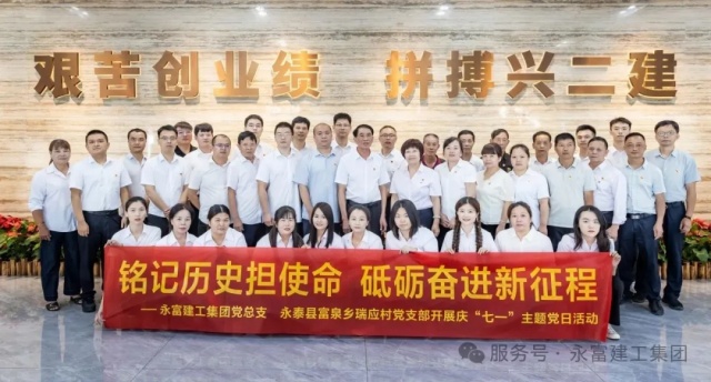 为庆祝中国共产党成立104周年,重温党的光辉历程,弘扬伟大建党精神,永富建工集团党总支﹑永泰县富泉乡瑞应村党支部联合组织开展“五个一”系列活动,引导全体党员赓续红色血脉,强化使命担当,汲取共同奋进力量。